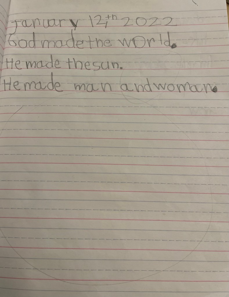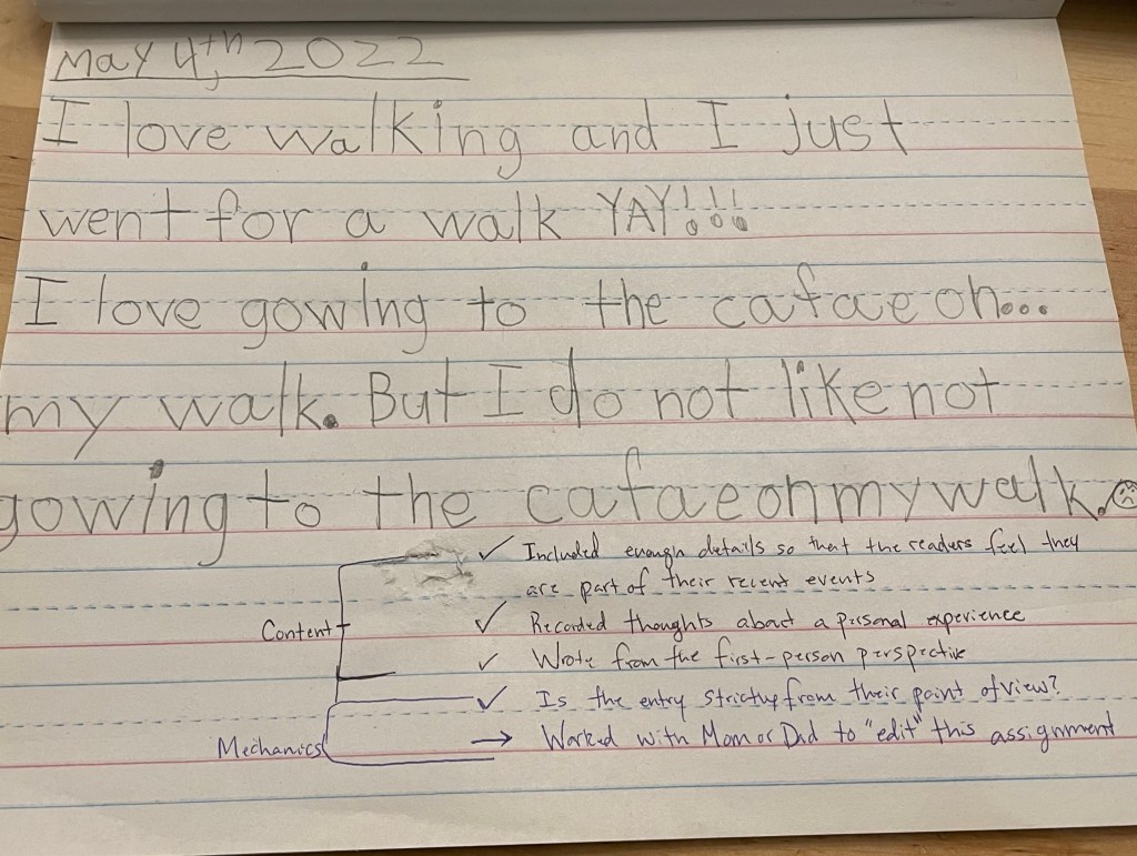 JOURNAL: Andromeda initially was advised to write “any three sentences” she wanted and she had some simultaneous help with spelling. More recently she has begun to free-write with some correction after completing her draft.