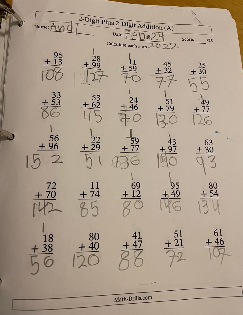 2 Digit Addition practice from 2/24/2022