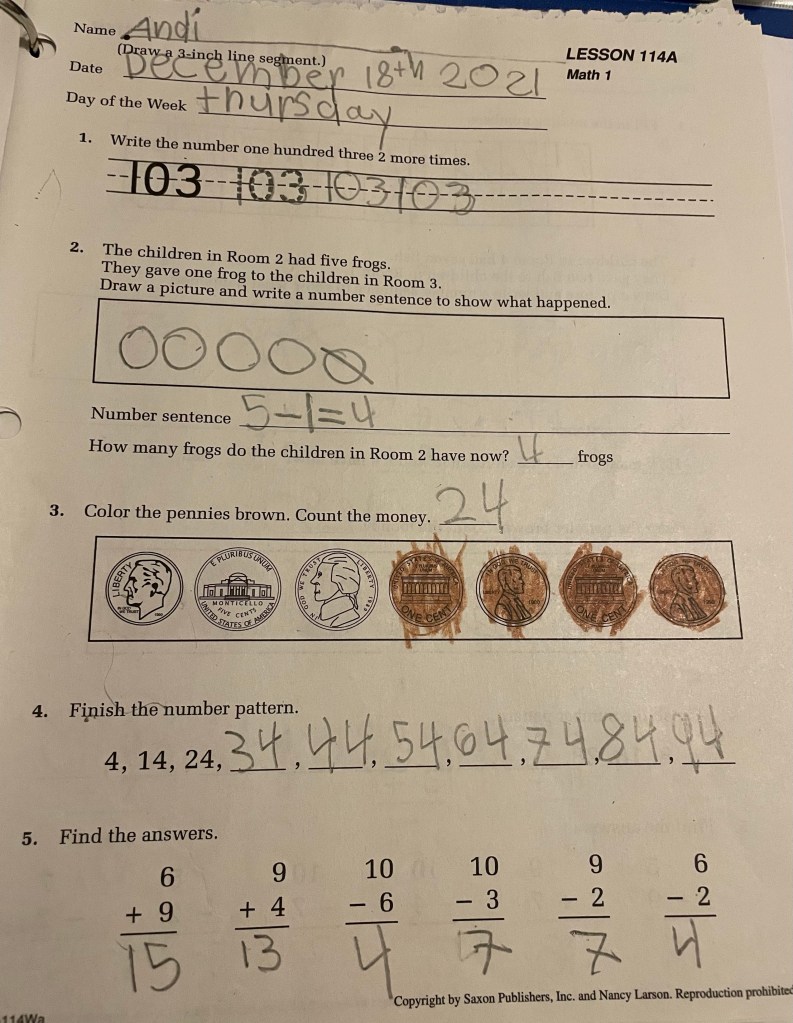 Saxon 1, Lesson 114 from 12/18/2021