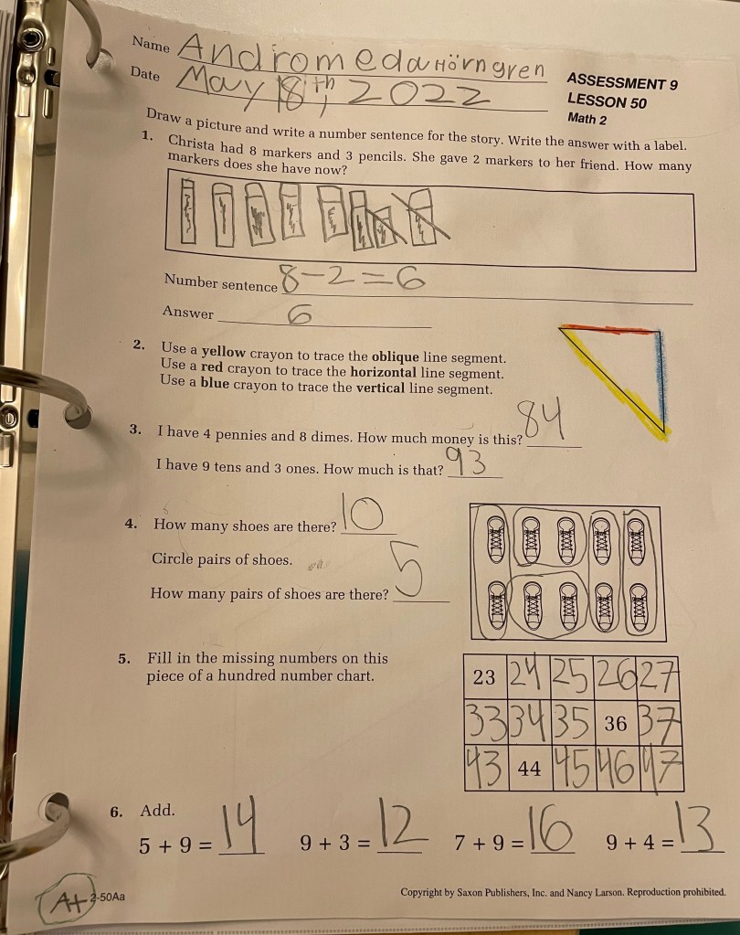 Saxon Math 2, Assessment #9 from 5/18/2022