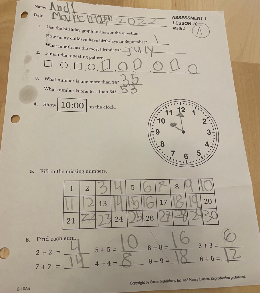 Saxon Math 2, Assessment #1 from 3/12/2022