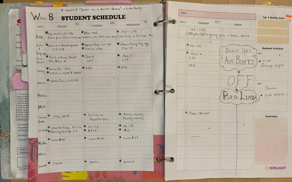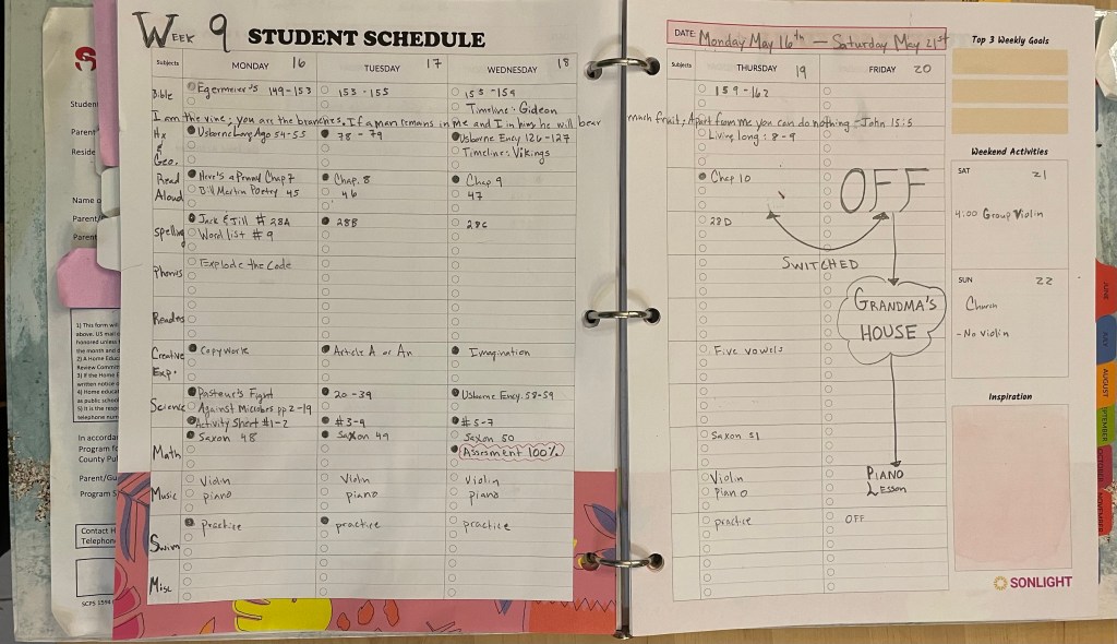 When we started using Sonlight curriculum in March 2022, weekly planning became the foundation of record keeping. Here are a few samples of what a week may look like. Andromeda usually spends Thursdays or Fridays at Grandma’s house for fun and piano lesson.